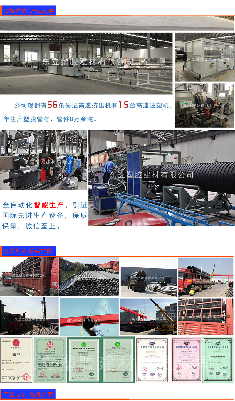 PE管采用目前世界上最先進(jìn)的技術(shù)生產(chǎn)制造的,具有高速擠出成型,熔融適度,自動(dòng)定尺切割,PLC控制生產(chǎn)全過程的先進(jìn)性能。